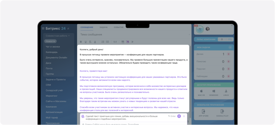 CoPilot — это мощный инструмент, который повышает эффективность в «Битрикс24», помогает бизнесу автоматизировать рутинные процессы, улучшать взаимодействие с клиентами и повышать эффективность команды. Он интегрирован во все основные модули, что делает его универсальным помощником в управлении задачами, создании контента, работе с CRM и многом другом.