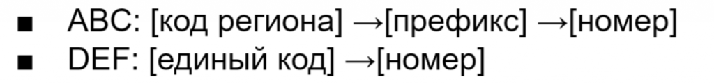 • DEF — мобильная/виртуальная нумерация, основана на кодах сетей. Подходит для масштабирования, кол-центров и федеральных кампаний.